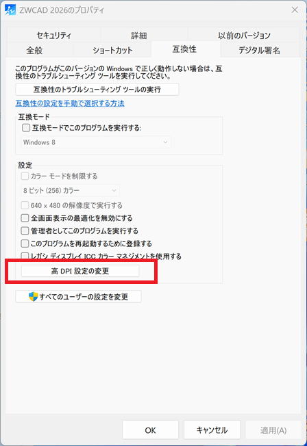 「互換性」タブをアクティブにして、[高 DPI 設定の変更] をクリック。