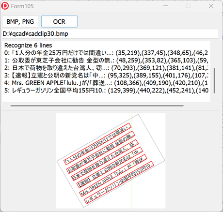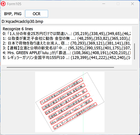 返ってくる text は、こちら↓ {'text': '(Press CTRL+C to quit)', 'text_angle': 0.06437717378139496, 'lines': [{'text': '(Press CTRL+C to quit)', 'bounding_rect': {'x1': 13.0, 'y1': 38.0, 'x2': 458.0, 'y2': 38.0, 'x3': 458.0, 'y3': 77.0, 'x4': 13.0, 'y4': 76.0}, 'words': [{'text': '(Press', 'bounding_rect': {'x1': 14.353108406066895, 'y1': 39.69878387451172, 'x2': 140.3456573486328, 'y2': 41.31085205078125, 'x3': 139.93304443359375, 'y3': 73.41635131835938, 'x4': 13.778392791748047, 'y4': 74.0859375}, 'confidence': 0.9870722889900208}, {'text': 'CTRL+C', 'bounding_rect': {'x1': 155.53341674804688, 'y1': 41.37630844116211, 'x2': 273.66094970703125, 'y2': 41.40755081176758, 'x3': 273.42254638671875, 'y3': 74.35794830322266, 'x4': 155.1415557861328, 'y4': 73.46490478515625}, 'confidence': 0.9822005033493042}, {'text': 'to', 'bounding_rect': {'x1': 298.973388671875, 'y1': 41.21086502075195, 'x2': 334.41058349609375, 'y2': 40.91863250732422, 'x3': 334.25103759765625, 'y3': 75.33767700195312, 'x4': 298.7672424316406, 'y4': 74.74362182617188}, 'confidence': 0.9981738328933716}, {'text': 'quit)', 'bounding_rect': {'x1': 357.4715881347656, 'y1': 40.60407257080078, 'x2': 459.0, 'y2': 38.89320755004883, 'x3': 459.0, 'y3': 78.0, 'x4': 357.3414306640625, 'y4': 75.82363891601562}, 'confidence': 0.9932758808135986}]}]} ちゃんと、座標と回転角度、忠実度が入っていますね。