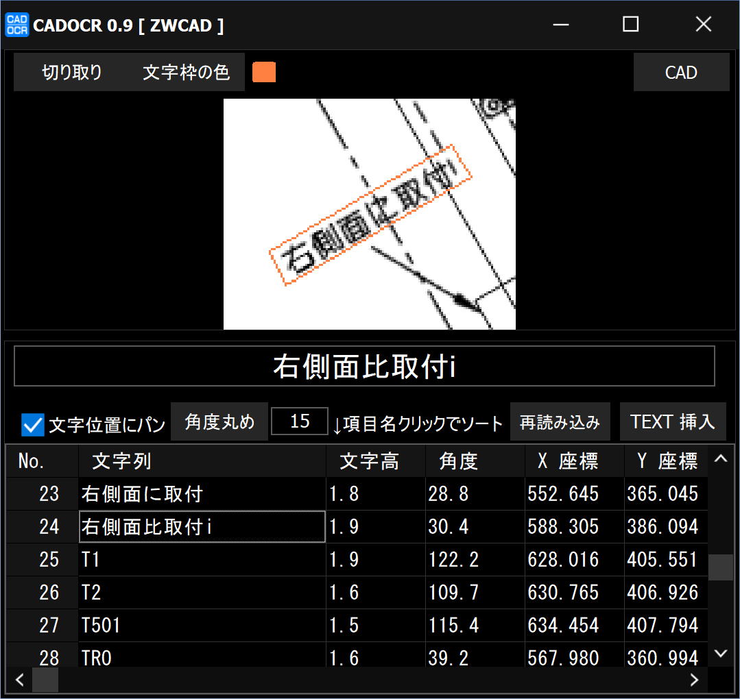 「TEXT 挿入」をクリックすると、CAD 上に OCR 文字が作成されます。