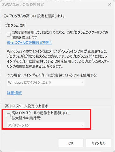 「高い DPI スケールの動作を上書きします。」のチェックをオンにして、